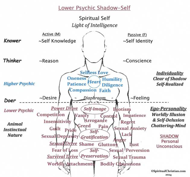 The consciousness which comprises our being is expressed as a triune intelligence of knowing, thinking and doing (see diagram at bottom). In this earthly life, we primarily experience conscious intelligence as the doing self which is referred to as our psycho-cognitive nature comprised of feeling, desire and intellect.